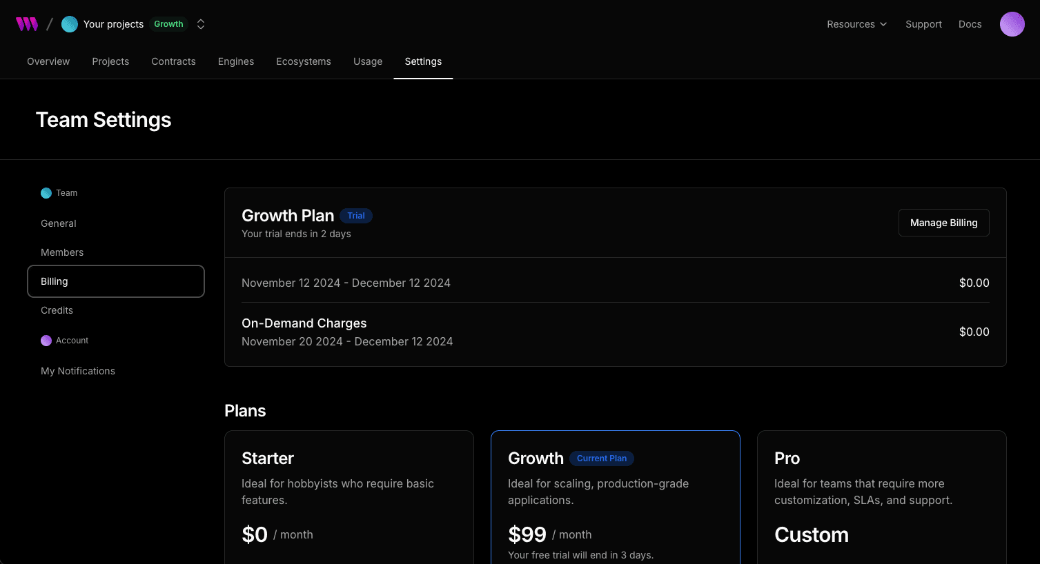 - On your dashboard, navigate to Settings > Billing > Manage Billing.
